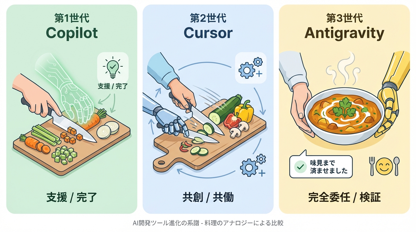 | 第1世代 | Copilot | 補完 | 「野菜を切るのを手伝います」(包丁はあなたが持つ) |