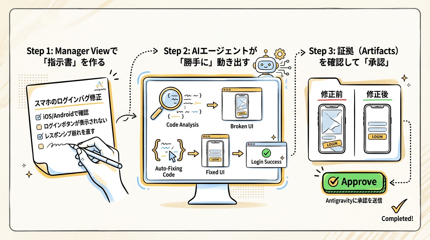 あなたはコードを1行も読まなくても、スクショを見て「お、直ってるね」と思ったら「Approve(承認)」ボタンを押すだけ。