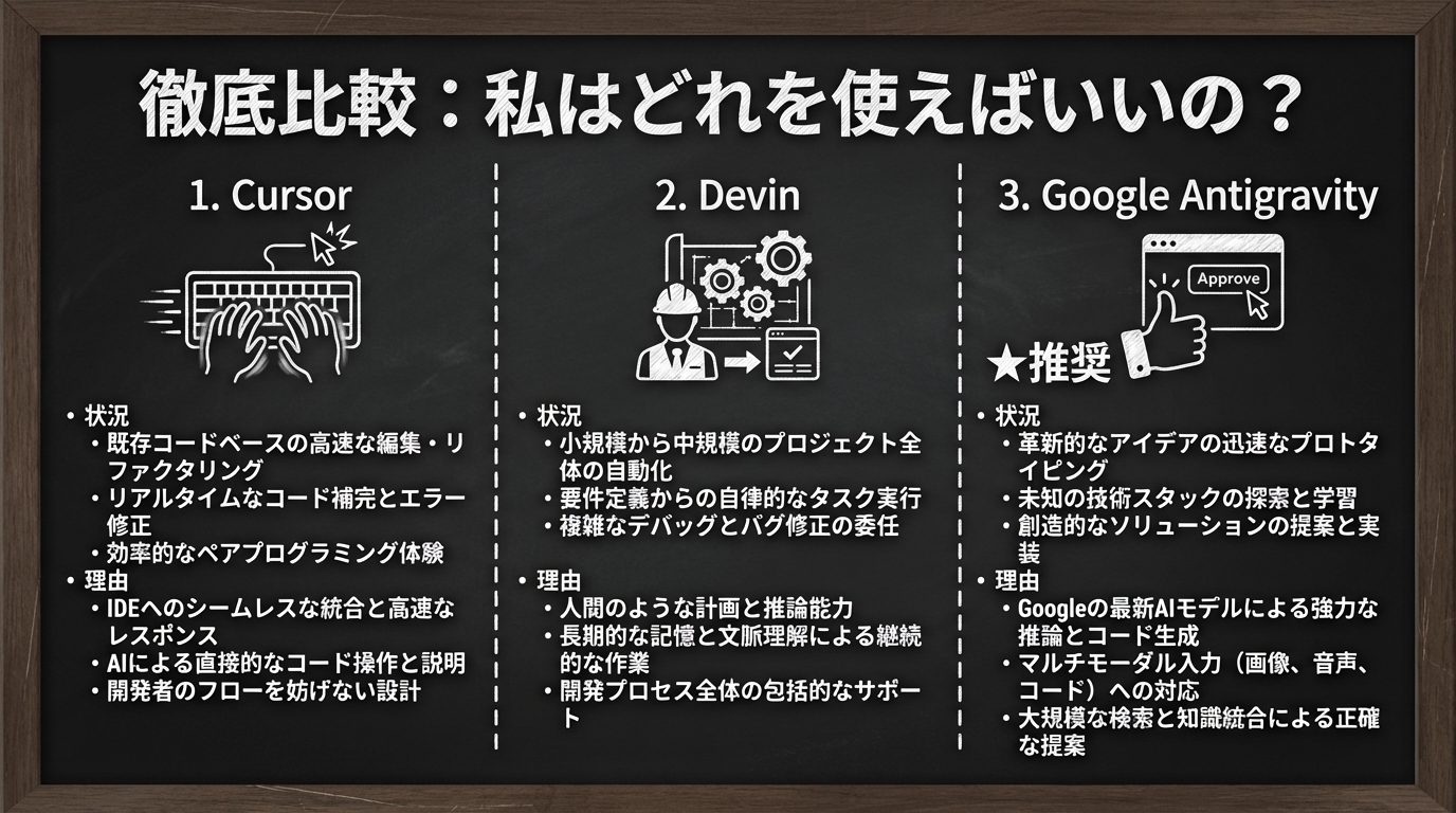 「すごいのは分かった。でもCursorも便利だし、Devinもあるし…結局どれ?」 迷っている方のために、「今のあなたの状況別」決定版チャートを作りました。