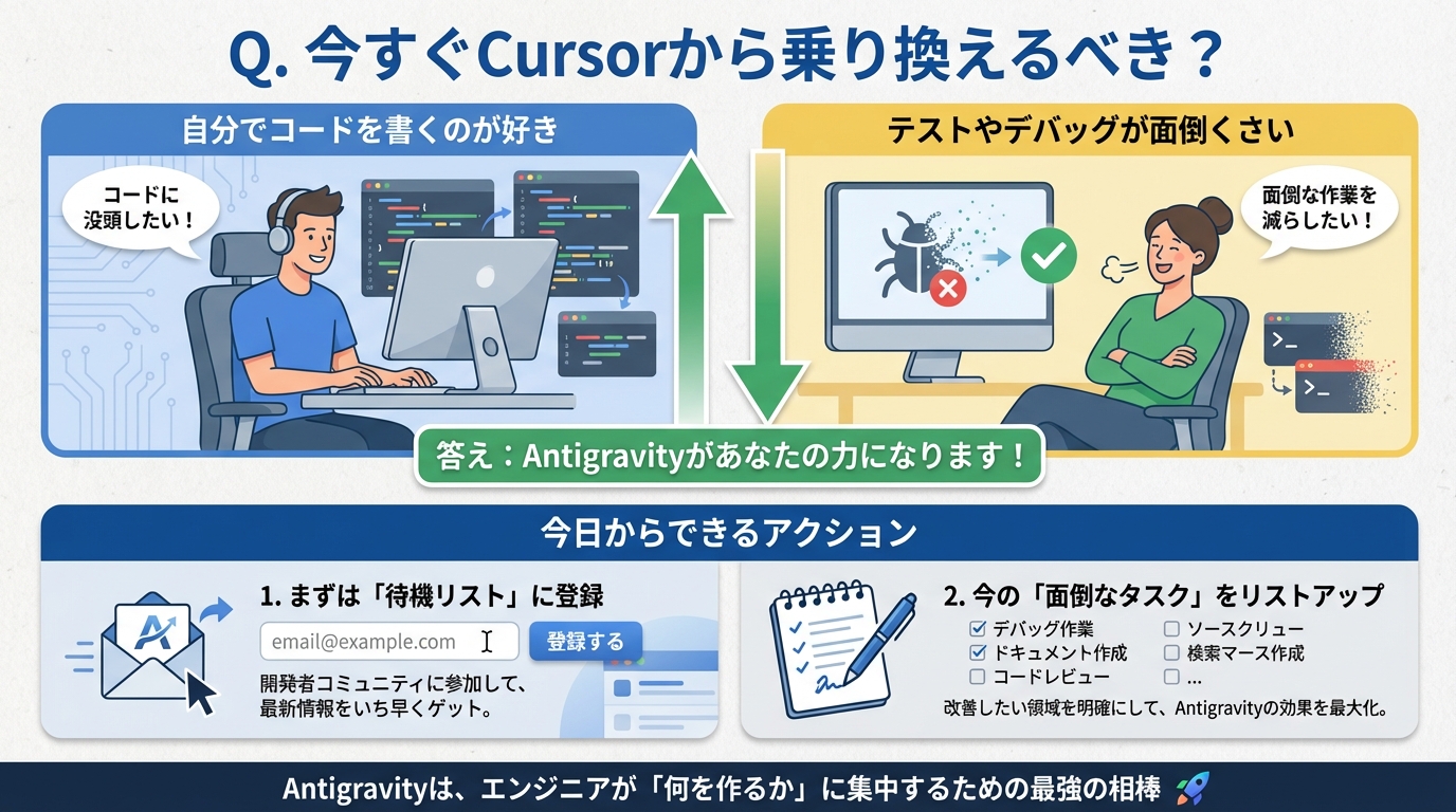 A. 現在、既に使われているんでしたらそのまま使って良いと尾も増す。 しかし、「テストやデバッグが面倒くさい」「もっと楽をして機能を実装したい」なら、Antigravityを試す価値は絶大です。